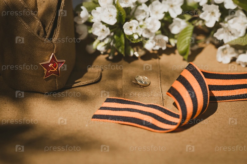 Знамя к 9 Мая. Военная форма, фуражка со звездой, георгиевской лентой и цветком сакуры на заднем плане. Концепция Дня Великой Победы 941-1945 гг. и Дня защитника Отечества