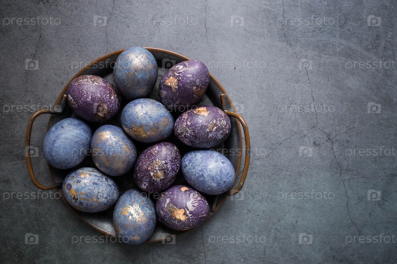 Пасхальная открытка с копией места для текста. Фиолетовые, синие и золотые яйца в железной тарелке на темном фоне. Тенденция фиолетового оттенка 2022 года очень яркая. Чай каркаде с натуральным красителем. Вид сверху