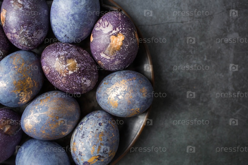 Пасхальная открытка с копией места для текста. Фиолетовые, синие и золотые яйца в железной тарелке на темном фоне. Тенденция фиолетового оттенка 2022 года очень яркая. Чай каркаде с натуральным красителем. Вид сверху