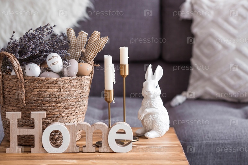 Прованс. Плетеная корзина с пасхальными яйцами, лавандой, свечами и белыми кроликами в интерьере гостиной на деревянном столе. Концепция домашнего уюта в светлый праздник Пасхи 2023