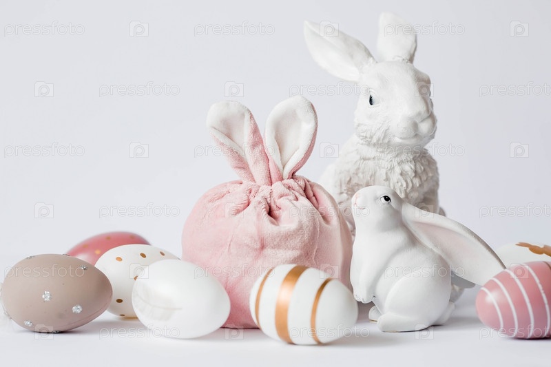 Красивая открытка. Баннер. Концепция светлого праздника Пасхи. Белые кролики и пасхальные яйца на белом изолированном фоне
