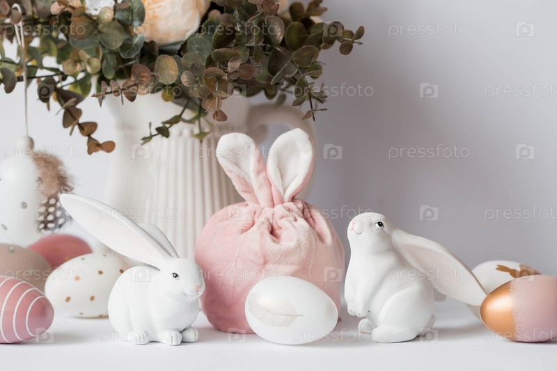 Красивая открытка. Баннер. Концепция светлого праздника Пасхи. Букет цветов, белые кролики и пасхальные яйца на белом изолированном фоне