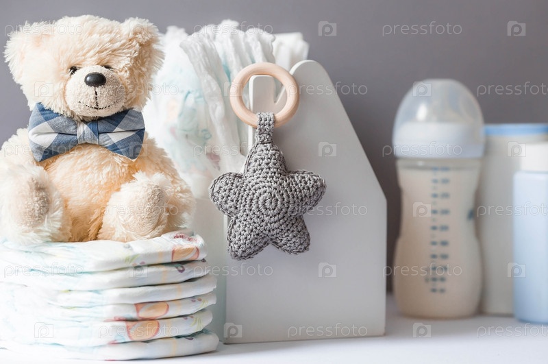 Деревянные игрушки, мишка в галстуке-бабочке, стопка подгузников, бутылочки без этикеток и детские принадлежности на пеленальном столике. Место для текста