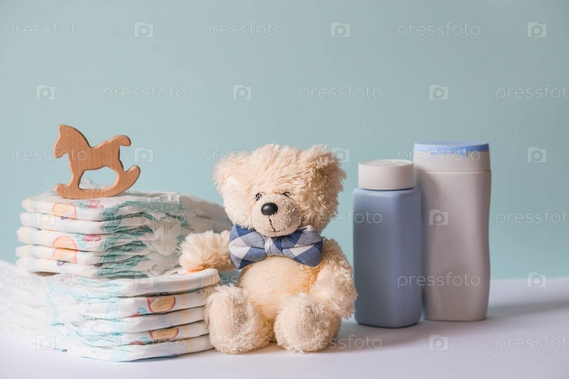 Деревянные игрушки, мишка в галстуке-бабочке, стопка подгузников, бутылочки без этикеток и детские принадлежности на пеленальном столике. Место для текста
