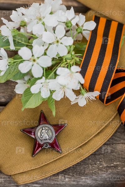 Георгиевская лента и орден Красной Звезды ветерана Великой Отечественной войны СССР на деревянном фоне. Перевод на русский язык: Рабочие всех стран объединяйтесь. Концепция праздника 9 мая