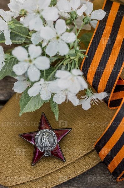 Георгиевская лента и орден Красной Звезды ветерана Великой Отечественной войны СССР на деревянном фоне. Перевод на русский язык: Рабочие всех стран объединяйтесь. Концепция праздника 9 мая