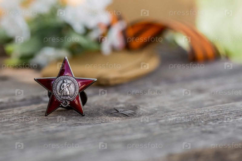 Георгиевская лента и орден Красной Звезды ветерана Великой Отечественной войны СССР на деревянном фоне. Перевод на русский язык: Рабочие всех стран объединяйтесь. Концепция праздника 9 мая
