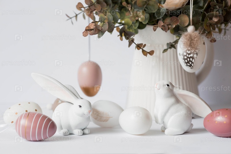 Красивая открытка. Баннер. Концепция светлого праздника Пасхи. Букет цветов, белые кролики и пасхальные яйца на белом изолированном фоне