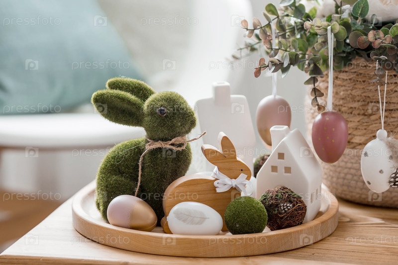 Красивая открытка. Концепция праздника Светлой Пасхи. Цветы, кролики, пасхальные яйца и скандинавские белые домики на деревянном столе в уютной гостиной