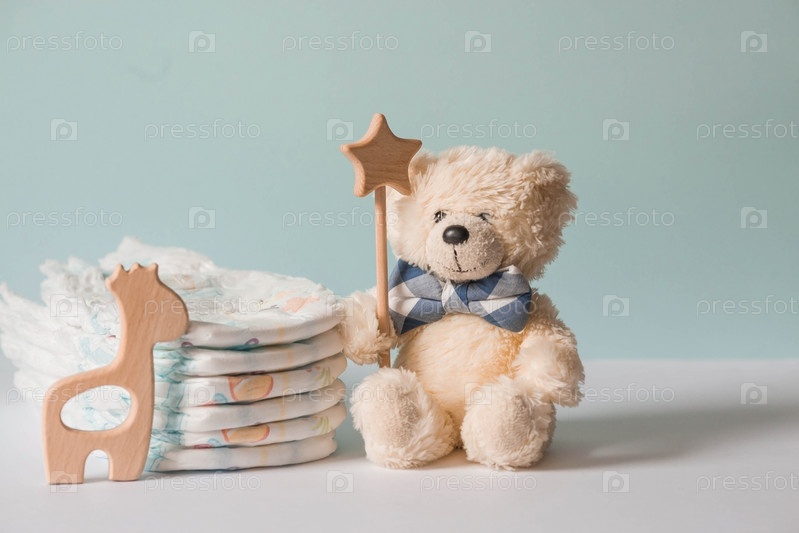 Деревянные игрушки, мишка в галстуке-бабочке, стопка подгузников и детских принадлежностей на пеленальном столике. Место для текста