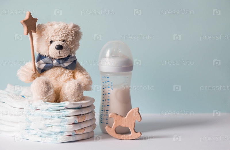 Деревянные игрушки, мишка в галстуке-бабочке, стопка подгузников, бутылочка и детские принадлежности на пеленальном столике. Место для текста