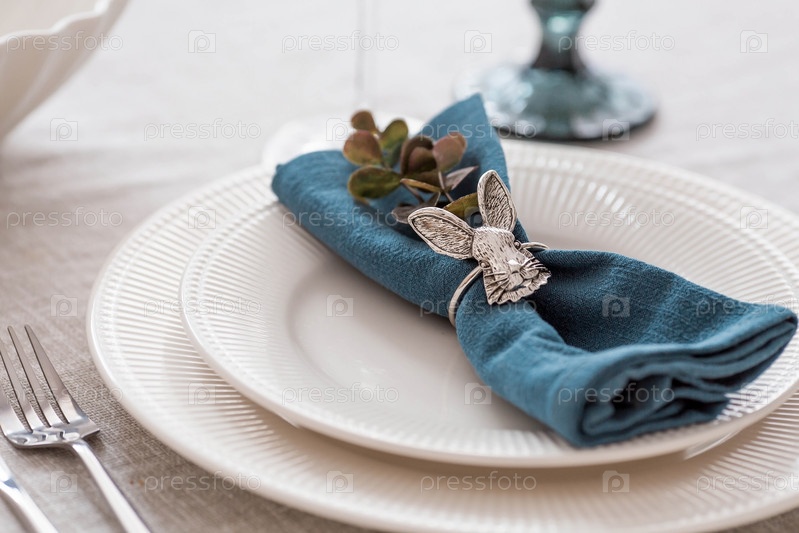 Красивая весенняя сервировка стола. Тарелка с хлопковой салфеткой с зайчиком. Столовое серебро и ваза с цветами на льняной скатерти. Концепция праздничной сервировки и яркого праздника Пасхи