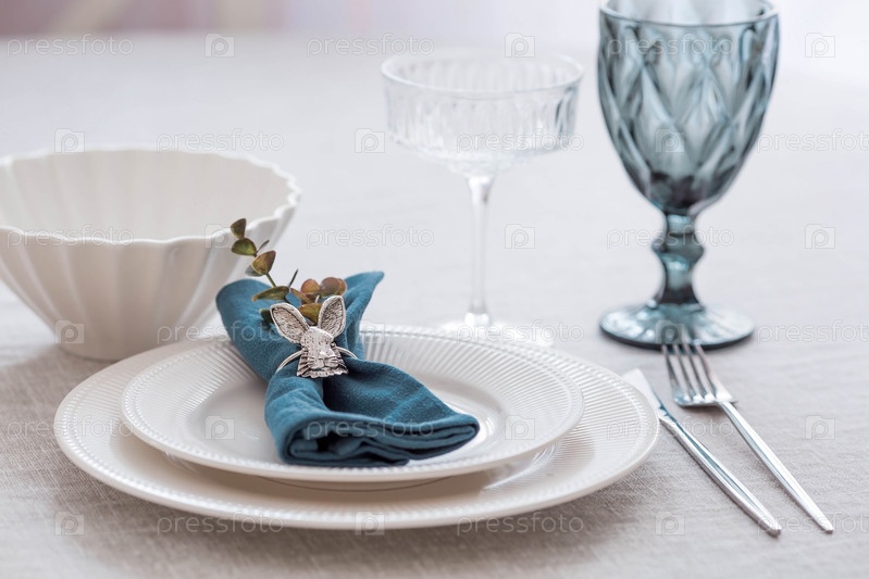 Красивая весенняя сервировка стола. Тарелка с хлопковой салфеткой с зайчиком. Столовое серебро и ваза с цветами на льняной скатерти. Концепция праздничной сервировки и яркого праздника Пасхи