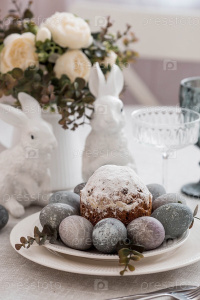 Весенняя сервировка стола. Тарелка с хлопковой салфеткой с зайчиком, тортом и пасхальными яйцами. Столовое серебро, пасхальные кролики и ваза с цветами на льняной скатерти. Концепция светлого праздника Пасхи