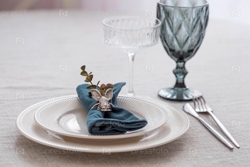 Красивая весенняя сервировка стола. Тарелка с хлопковой салфеткой с зайчиком. Столовое серебро и ваза с цветами на льняной скатерти. Концепция праздничной сервировки и яркого праздника Пасхи