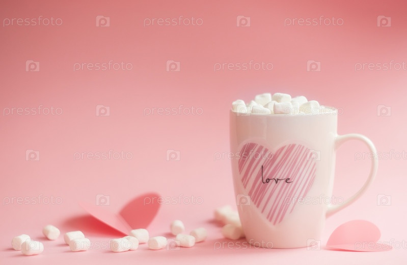 Баннер. Кружка со сладостями и зефиром на розовом фоне. Романтика, день святого валентина. Концепция праздника. Сезонный зимний февральский праздник, женщина, день матери