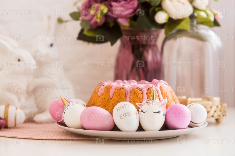 Баннер. Минимальная концепция. Кулич, кролики и яйца в виде единорога и с золотым узором на белом столе. Скопируйте место для текста