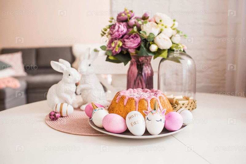 Баннер. Минимальная концепция. Кулич, кролики и яйца в виде единорога и с золотым узором на белом столе. Скопируйте место для текста