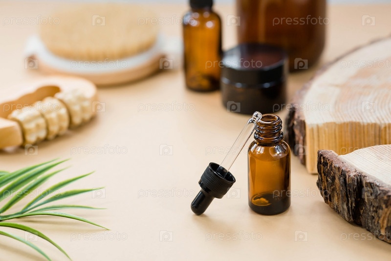 На деревянной подставке стояла стеклянная бутылка с пипеткой для масла и массажная щетка. Натуральная органическая экокосметика. Макет брендинга салона красоты. Ароматерапия