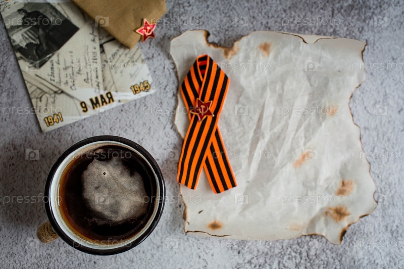 Георгиевская лента, кофейная кружка, тюльпаны и обожженная бумага для заметок на бетонном фоне. Надпись на открытке на русском языке: «Великая Победа 9 мая». Вид сверху, место для копирования текста