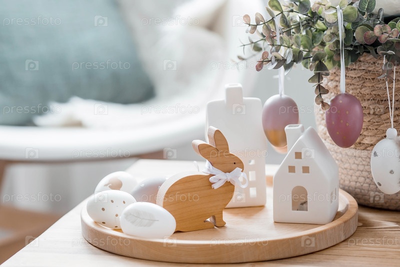 Красивая открытка. Концепция праздника Светлой Пасхи. Цветы, кролики, пасхальные яйца и скандинавские белые домики на деревянном столе в уютной гостиной