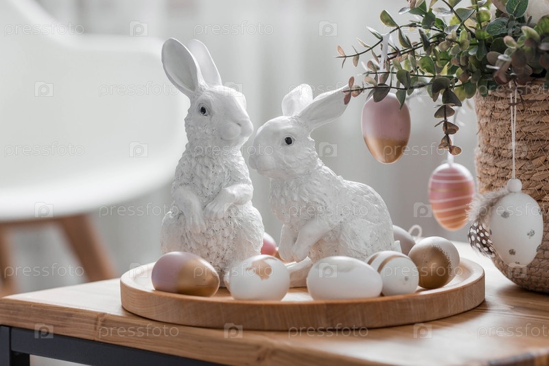 Красивая открытка. Концепция праздника Светлой Пасхи. Цветы, кролики, пасхальные яйца и скандинавские белые домики на деревянном столе в уютной гостиной
