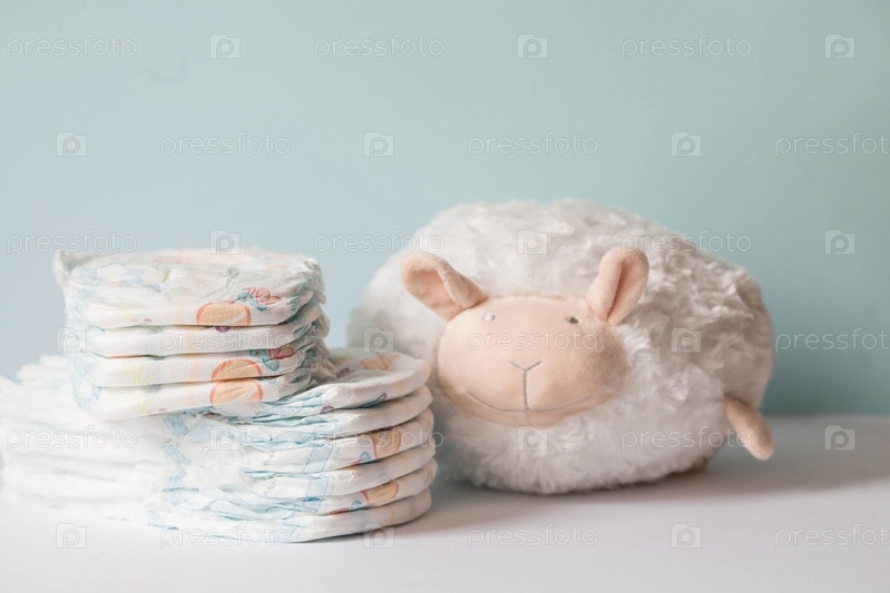 Мягкая игрушка-овца и стопка подгузников на пеленальном столике. Место для текста