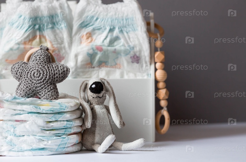 Стопка подгузников и мягких игрушек на пеленальном столике. Место для текста