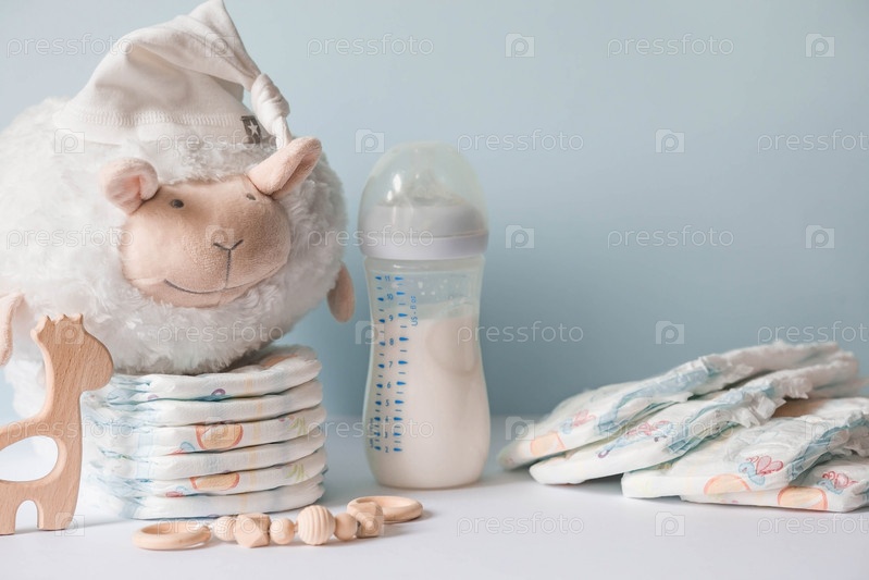 Деревянные игрушки, мягкая овечка, стопка подгузников, бутылочка молока и детские принадлежности на пеленальном столике. Место для текста