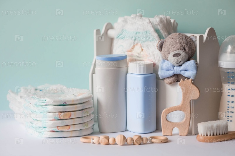 Деревянные игрушки, мишка в галстуке-бабочке, стопка подгузников, бутылочки без этикеток и детские принадлежности на пеленальном столике. Место для текста