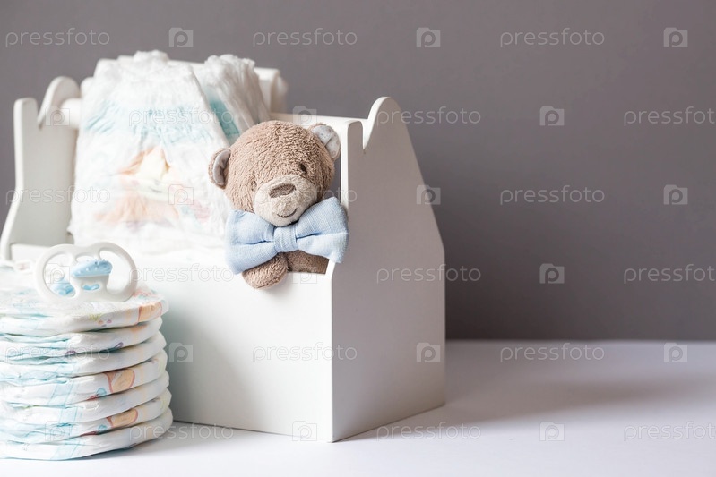 Деревянные игрушки, мишка в галстуке-бабочке, стопка подгузников, бутылочки без этикеток и детские принадлежности на пеленальном столике. Место для текста