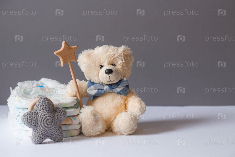 Деревянные игрушки, мишка в галстуке-бабочке, стопка подгузников и детских принадлежностей на пеленальном столике. Место для текста