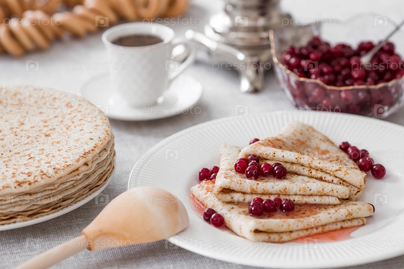 Русские традиции. Русский праздник Масленица. Натюрморт с чашкой чая, стопкой блинов с северной клюквой, кубиками масла и самоварами на столе