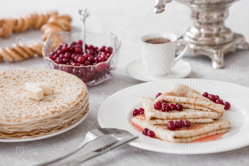 Русские традиции. Русский праздник Масленица. Натюрморт с чашкой чая, стопкой блинов с северной клюквой, кубиками масла и самоварами на столе
