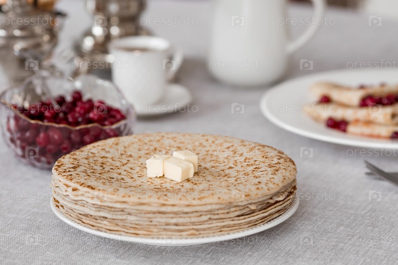 Русские традиции. Русский праздник Масленица. Натюрморт с чашкой чая, стопкой блинов с северной клюквой, кубиками масла и самоварами на столе