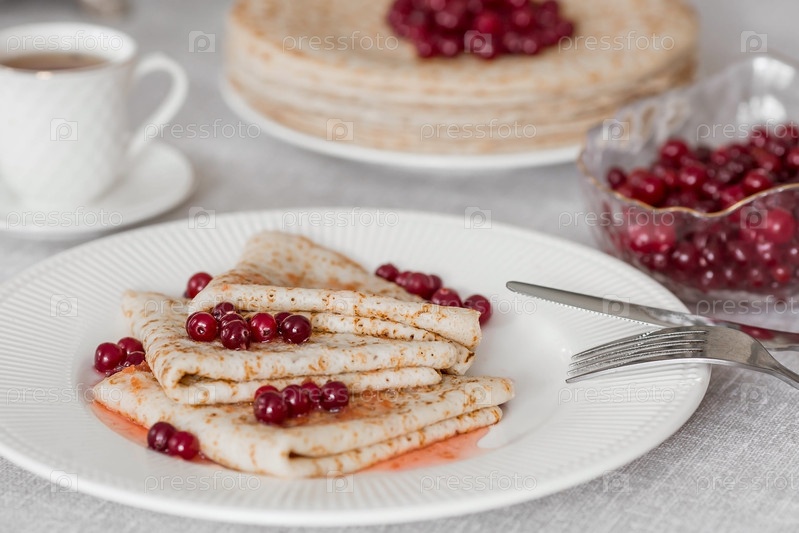 Русские традиции. Русский праздник Масленица. Натюрморт с чашкой чая, стопка блинов с северной клюквой, кубики масла на столе