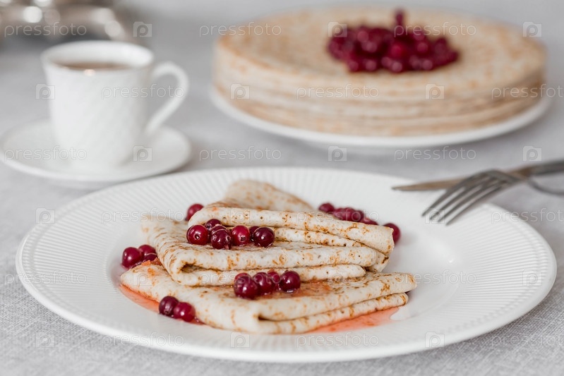 Русские традиции. Русский праздник Масленица. Натюрморт с чашкой чая, стопка блинов с северной клюквой, кубики масла на столе