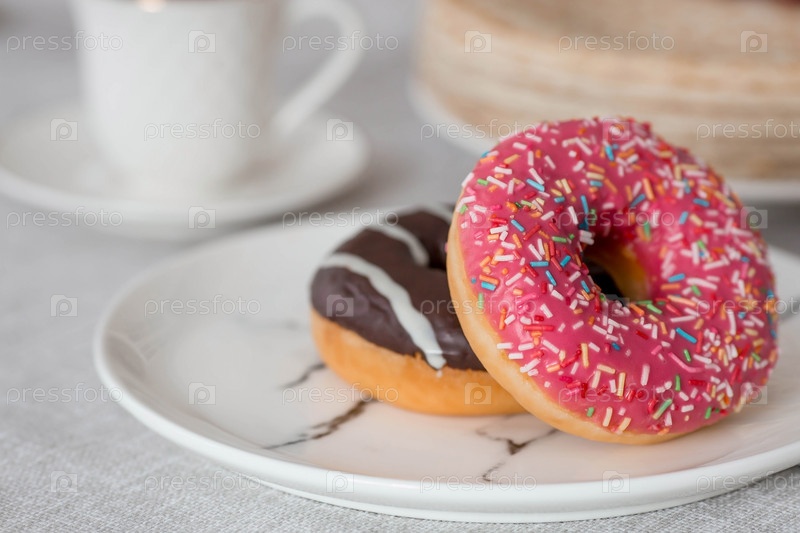 Вкусный десерт. Розовый и шоколадный пончик с разноцветными брызгами, чашка черного кофе или чая. Сладости