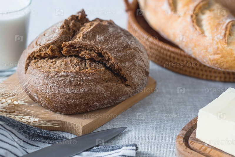 Свежий вкусный хлеб крупным планом. Свежеиспеченный хлеб на закваске с золотой корочкой на деревянной доске. Контекст пекарни с вкусным хлебом. Кондитерские изделия