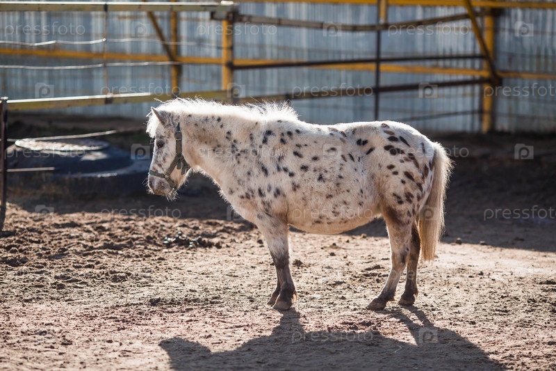 Порода декоративных карликовых лошадей. Милый маленький мини-пони на ферме. Крупный план портрета животного