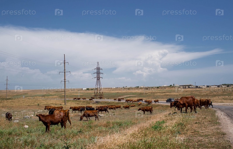 В поле пасется много коров. Крым, Россия