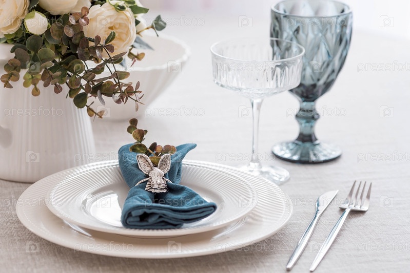 Красивая весенняя сервировка стола. Тарелка с хлопковой салфеткой с зайчиком. Столовое серебро и ваза с цветами на льняной скатерти. Концепция праздничной сервировки и яркого праздника Пасхи