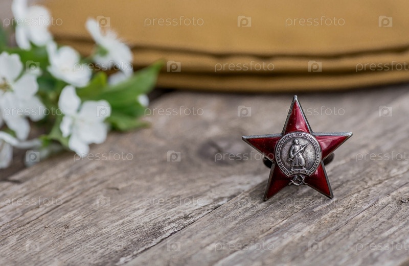 Георгиевская лента и орден Красной Звезды ветерана Великой Отечественной войны СССР на деревянном фоне. Перевод на русский язык: Рабочие всех стран объединяйтесь. Концепция праздника 9 мая