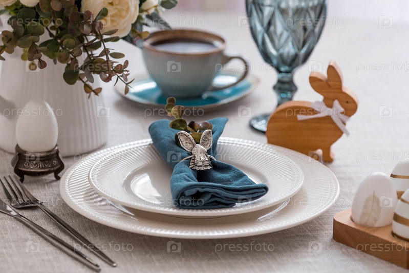 Красивая весенняя сервировка стола. Тарелка с хлопковой салфеткой с зайчиком. Столовое серебро и ваза с цветами на льняной скатерти. Концепция праздничной сервировки и яркого праздника Пасхи