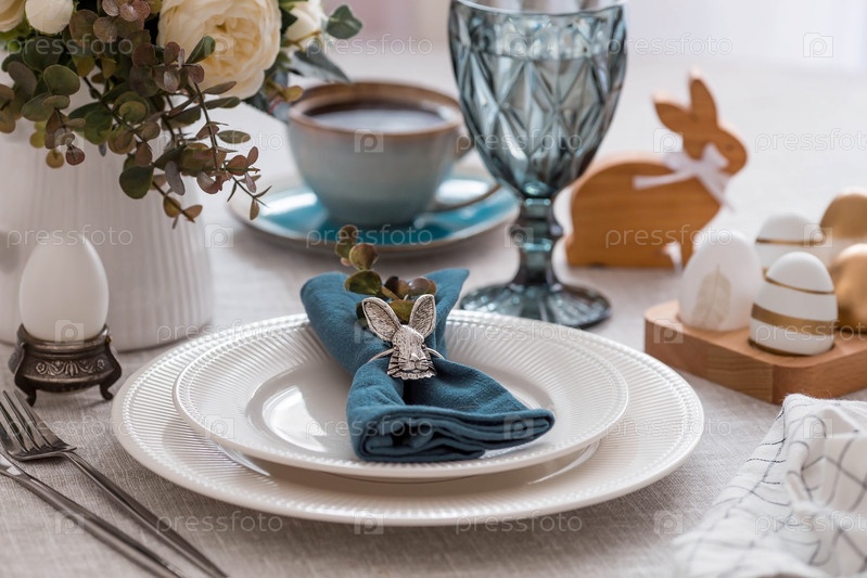 Красивая весенняя сервировка стола. Тарелка с хлопковой салфеткой с зайчиком. Столовое серебро и ваза с цветами на льняной скатерти. Концепция праздничной сервировки и яркого праздника Пасхи
