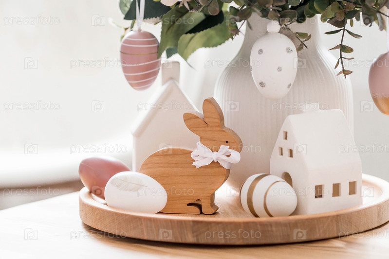 Красивая открытка. Концепция праздника Светлой Пасхи. Цветы, кролики, пасхальные яйца и скандинавские белые домики на деревянном столе в уютной гостиной