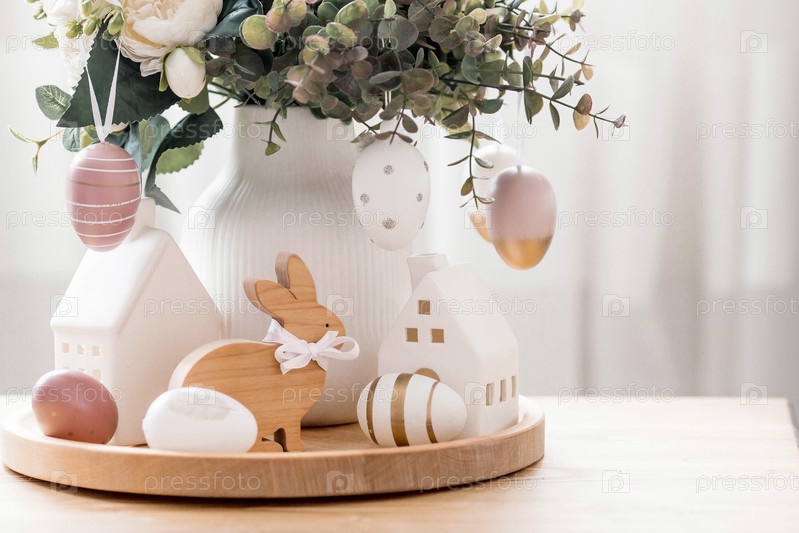 Красивая открытка. Концепция праздника Светлой Пасхи. Цветы, кролики, пасхальные яйца и скандинавские белые домики на деревянном столе в уютной гостиной