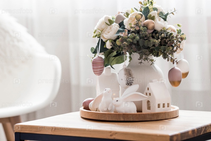 Красивая открытка. Концепция праздника Светлой Пасхи. Цветы, кролики, пасхальные яйца и скандинавские белые домики на деревянном столе в уютной гостиной