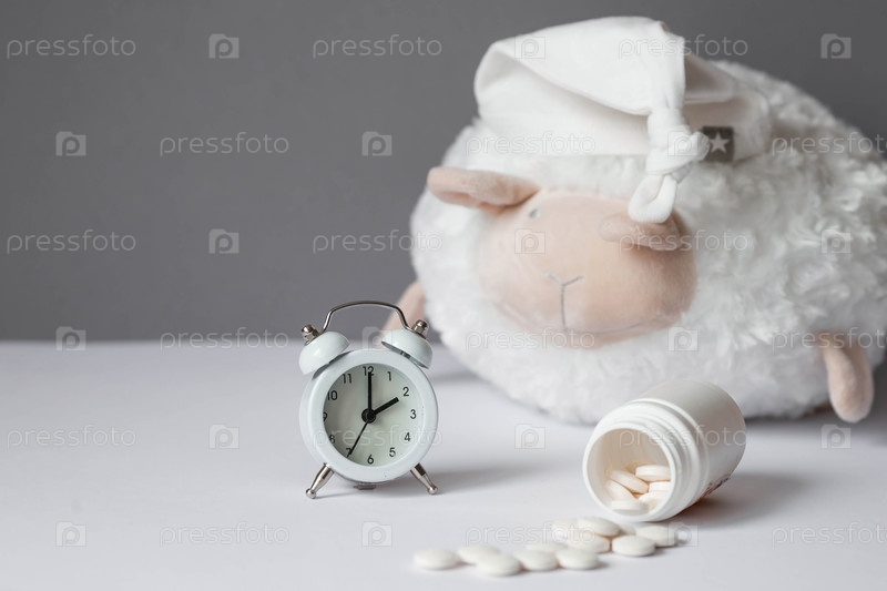 Тюбик с таблетками, овца в шапочке для сна и будильник. Время на часах 2 часа ночи. Бессонница и восстановление режима сна. Считай овец, чтобы заснуть