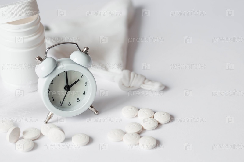 Тюбик с таблетками и будильник. Время на часах 2 часа ночи. Бессонница и восстановление режима сна. Принимать таблетки по часам